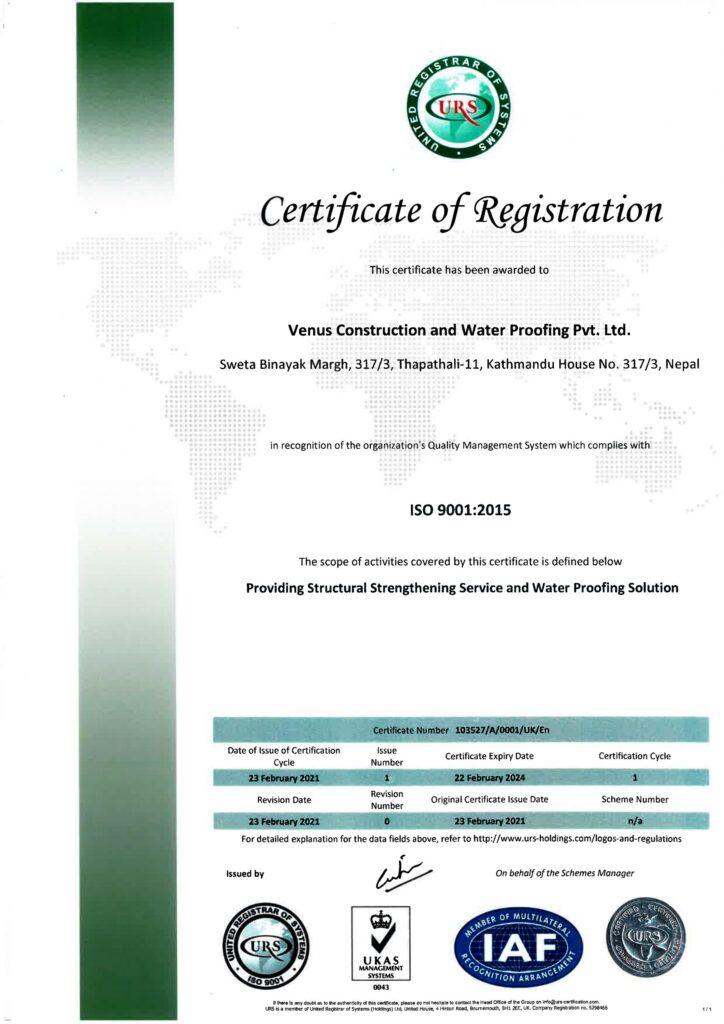 ISO 9001:2015 is an international standard dedicated to Quality Management Systems (QMS). It outlines a framework for improving quality and a vocabulary of understanding for any organization looking to provide products and services that consistently meet the requirements and expectations of customers and other relevant interested parties in the most efficient manner possible. The QMS is the aggregate of all the processes, resources, assets, and cultural values that support the goal of customer satisfaction and organizational efficiency. Venus Construction and Water Proofing Pvt. Ltd. got its ISO 9001:2015 certification on 22nd February 2021. The scope of the activities covered by the certificate was defined as “Providing Structural Strengthening Service and Water Proofing Solutions”.